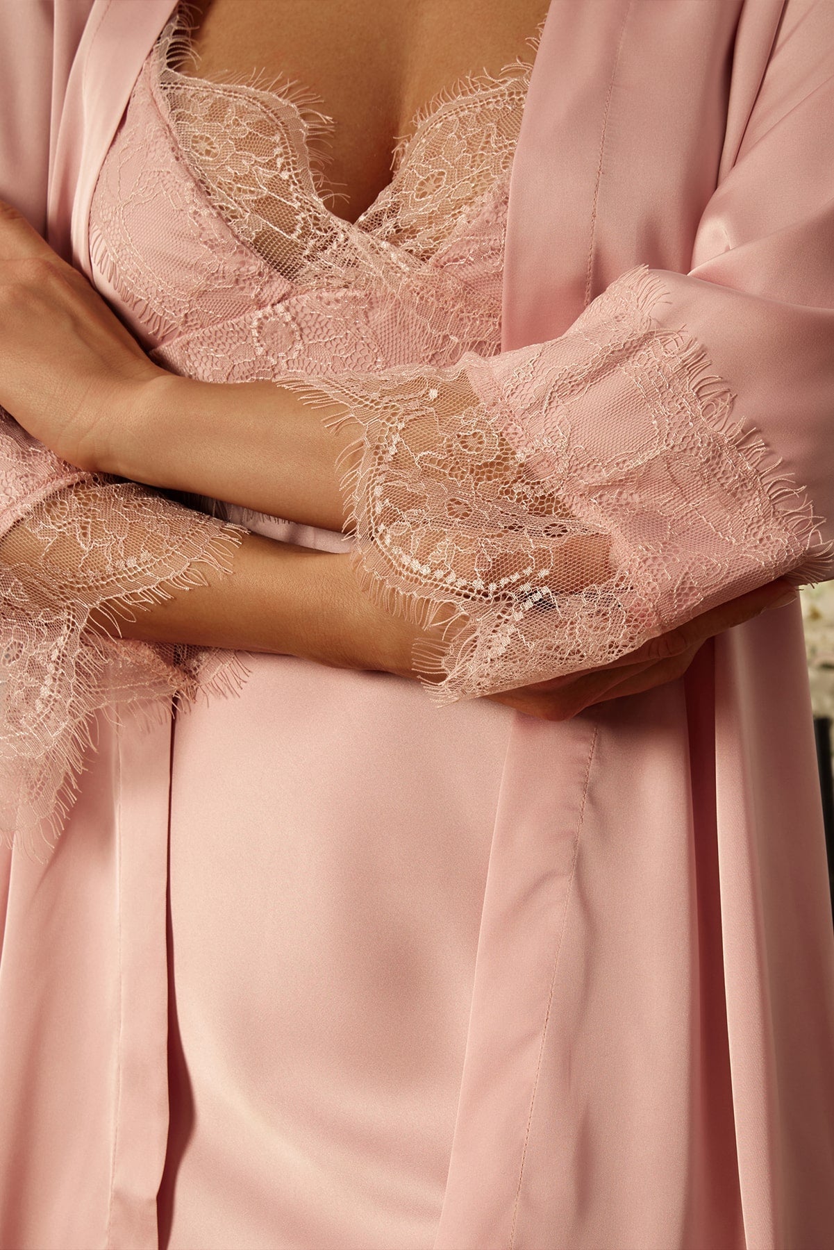 Elevate your intimate moments with our Titania set. This luxurious two-piece ensemble features a flowing satin robe with delicate eyelash lace trim on the sleeves, paired with a matching chemise.